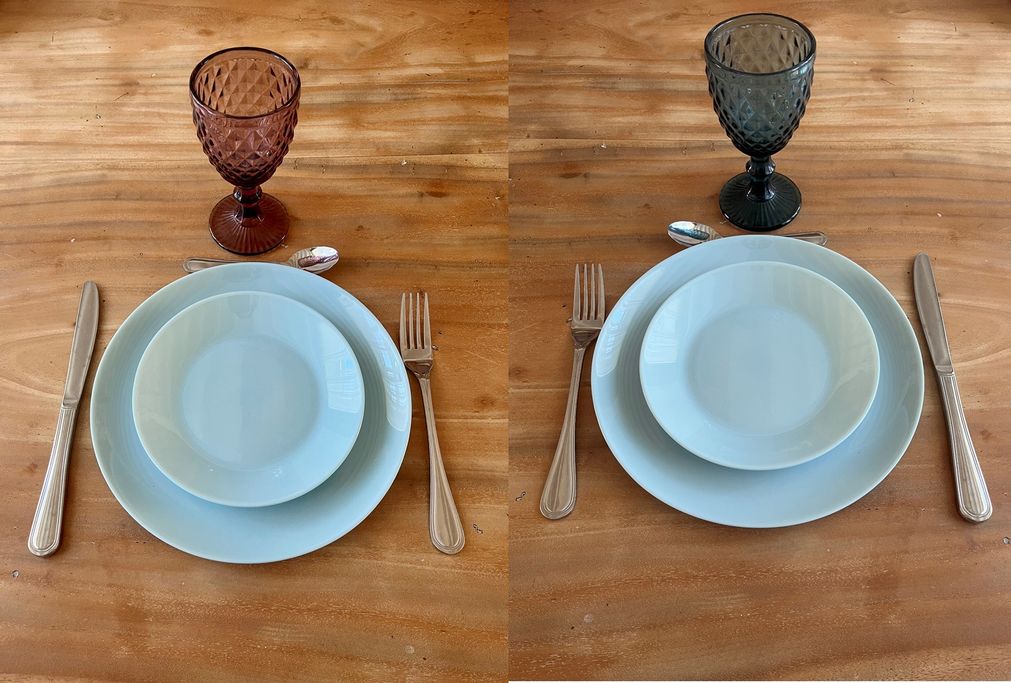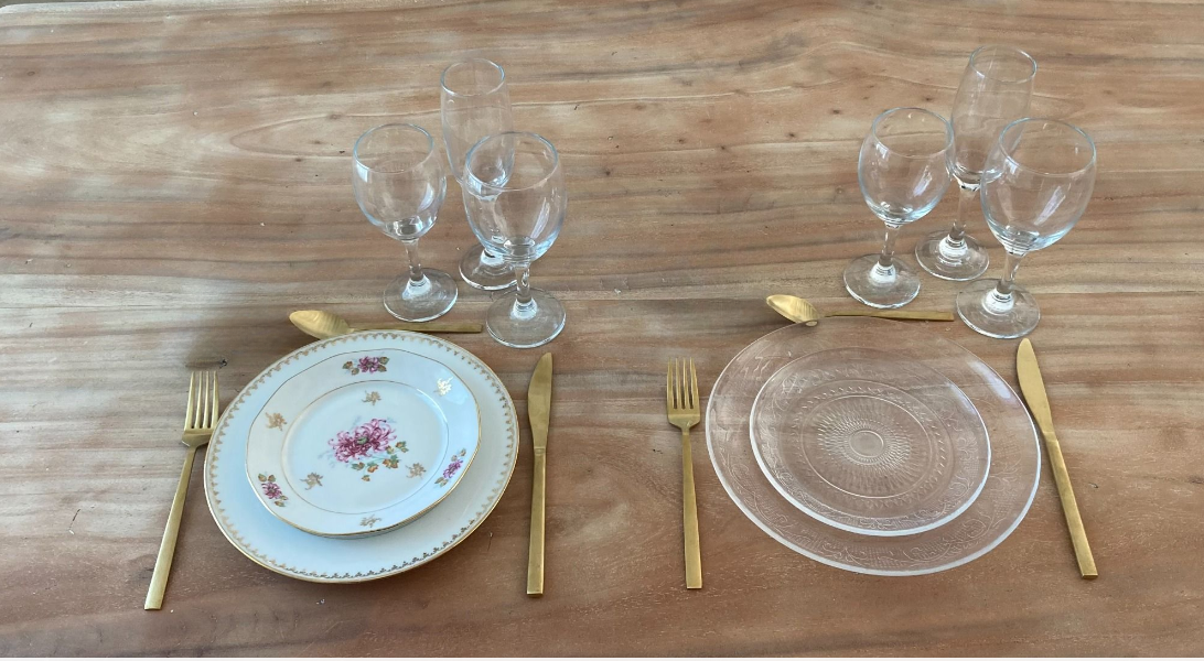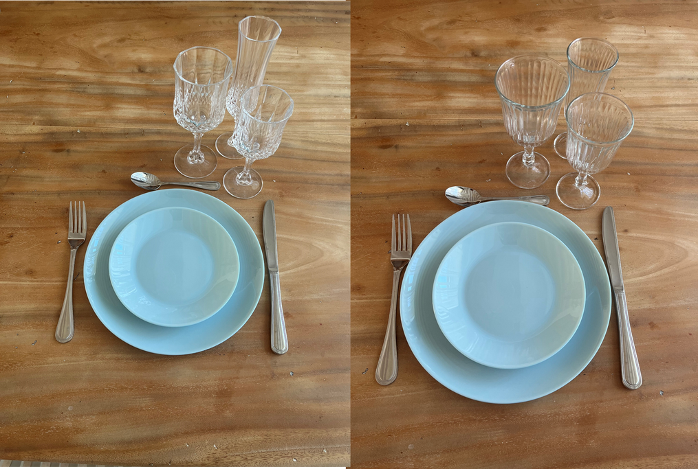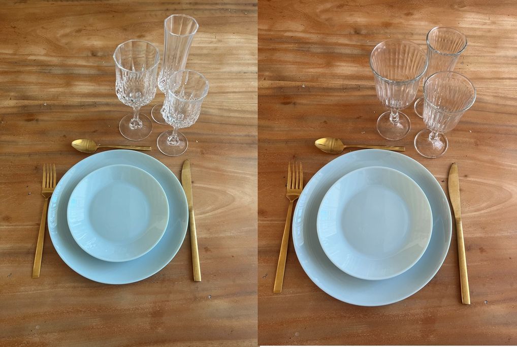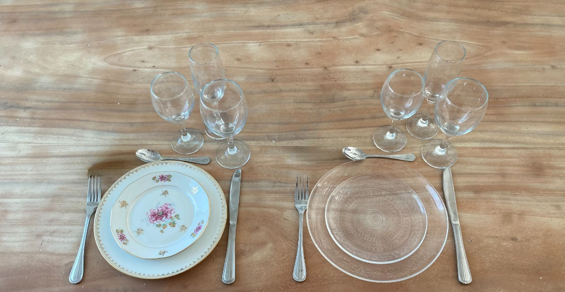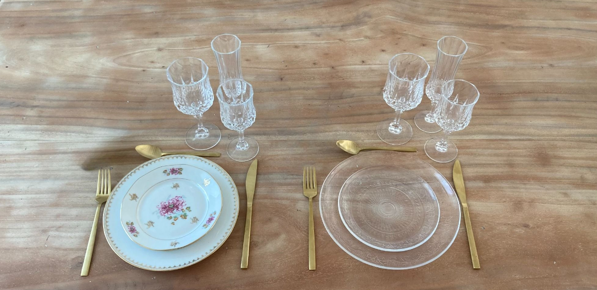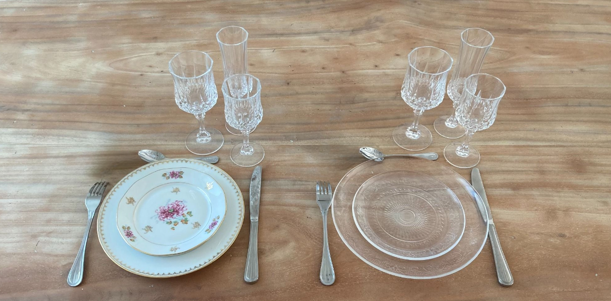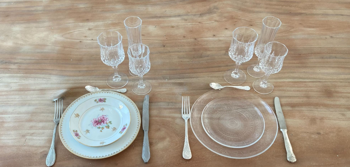 Voici une partie des kits vaisselles possible à la location, sur une base de trois assiettes et trois verres. Besoin d'une assiette en moins, un verre en plus... N'hésitez pas à nous contacter.