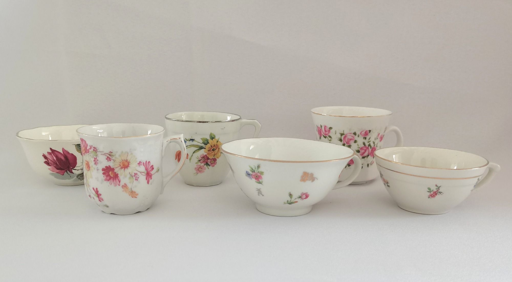 Les tasses et soucoupes sont composées de deux gammes assorties aux assiettes. Les fleuries dépareillées et les Rachel qui sont transparentes. Les soucoupes peuvent également servir d'assiettes à pain.